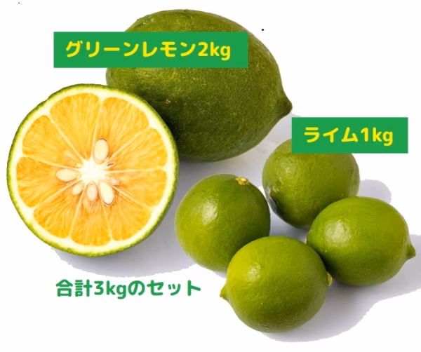 当園でも人気の高いグリーンマイヤーレモン(果皮が緑色)約2㎏とライム約1㎏をご家庭でも使いやすい計3kgセットにてお届けいたします。