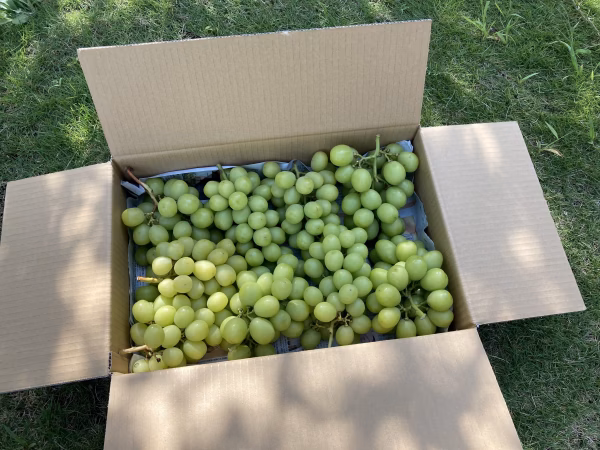 房型が崩れていたり、穴あきの房(傷んだ粒を抜いたなどのため)をお詰めします。箱にウレタンネットと新聞紙を敷き、その上に直接葡萄を納めるエコ包装でお届けします。