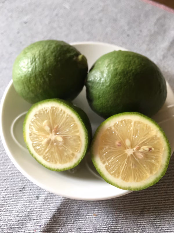 グリーンレモンはなんといっても爽やかな香りが特徴です。夏から秋にかけてのこの時期だけのレモンです。冬にかけてだんだん黄色に近づいていきます。サイズは普通サイズ(100グラム前後)を中心に混合サイズです。ほぼ正品ですが、写真のように少し外皮にキズがあるものも含まれます。グリーンレモンは爽やかな香りの皮もぜひお使いください。