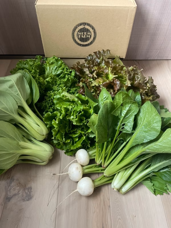 80サイズの箱に、レタス類3種類とおまかせ野菜を2種類、合計5品目でお届け致します。