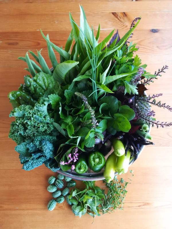 化学農薬、化学肥料、動物性の堆肥や肥料を使わず(栽培基準等、詳細はプロフィールをご覧ください)、少量多品種の野菜を栽培している当園のいろいろなハーブや野菜が少しずつ入ったセットです。60サイズ、または80サイズの箱(3辺の合計が60cm、または80cm以内の箱です)にしっかり詰めてお届けします。