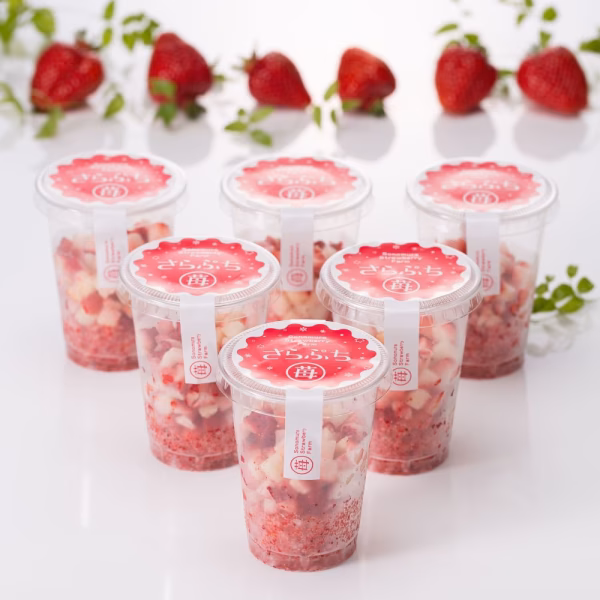 日本初※冷凍いちごパウダーの「さら苺」と、冷凍いちごをダイスカットした「ぷち苺」を2層にして1つのカップにしました。お好みで練乳をかけてお召し上がりください。よくかき混ぜて練乳とからめると美味しさ倍増です。夏の暑い時期にひんやりとした練乳いちごはいかがですか♪