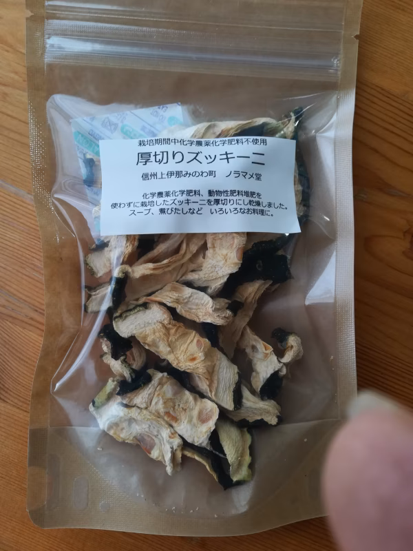 化学農薬、化学肥料、動物性の肥料堆肥を使わずに栽培したズッキーニを手軽に食べられるよう乾燥させました。