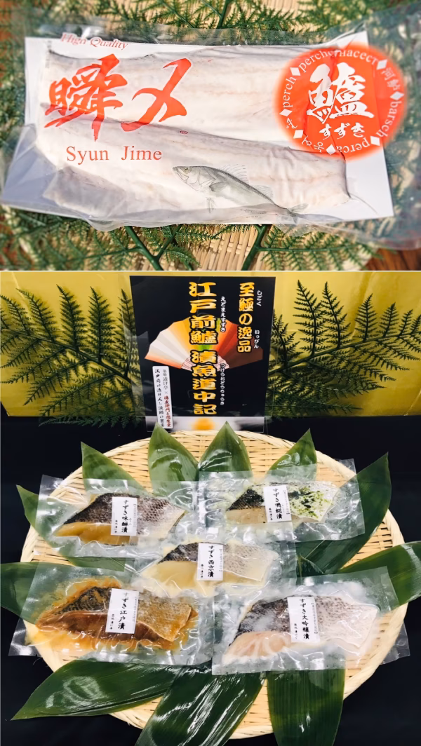 全国プライドフィッシュ、千葉ブランドにも認定されている『瞬〆すずき』を、三枚におろしアルコール凍結機『凍眠』を用いてわずか20秒ほどで冷凍した商品と。船橋で水揚げされた漬魚に加工した五種類の定番の漬魚を各1枚(計5枚)のセット商品をまとめました。