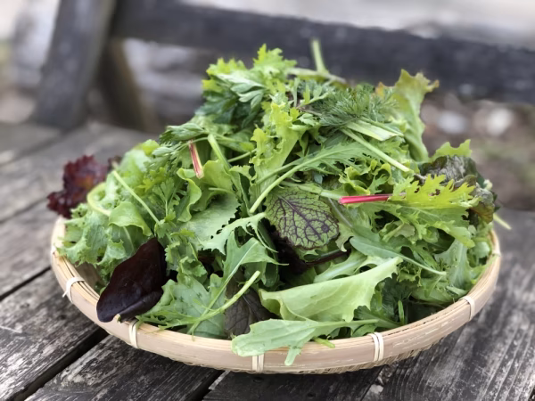 定番のレタス数種類からはじまり、ルッコラなど香りの良いハーブ系、その他ほろ苦いもの、ピリ辛でアクセントになるもの、彩りのきれいなもの、その数多いときで30種類以上のサラダ専用野菜をオリジナルブレンドで作り上げるサラダです。
