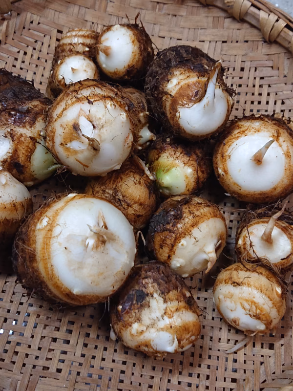 サトイモの品種の「土垂(どだれ)」です。関東地方で広く栽培が行われています。肉質はやわらかく、ねっとりとしていて煮崩れしにくいのが特徴。里芋のぬめり成分は、胃の粘膜を保護したり免疫力を高めたりするといわれます。