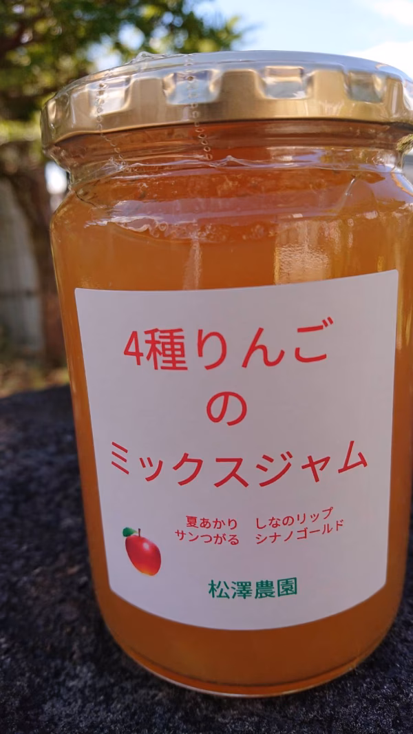 今年収穫した4品種のりんごのミックスジャム390g(しなのリップ、夏あかり、サンつがる、シナノゴールド)です。
