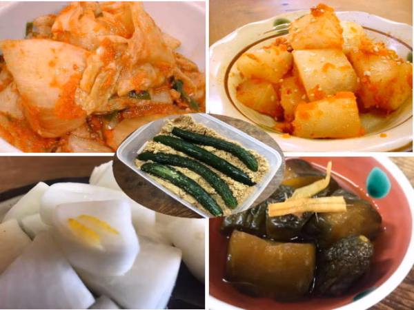 ぬか床セットに旬のぬか漬け×2、それに風来の看板漬物、白菜キムチ、そして大根キムチ、胡瓜の新生姜甘辛醤油漬け、ゆず大根のセットになります。どちらもご飯がススム漬物です。この機会にぜひどうぞ