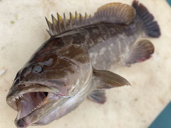 大きな岩がゴツゴツしていてクエが住み着きやすいポイントを狙って縄を仕掛け、約1時間後に回収しクエを釣り上げます。