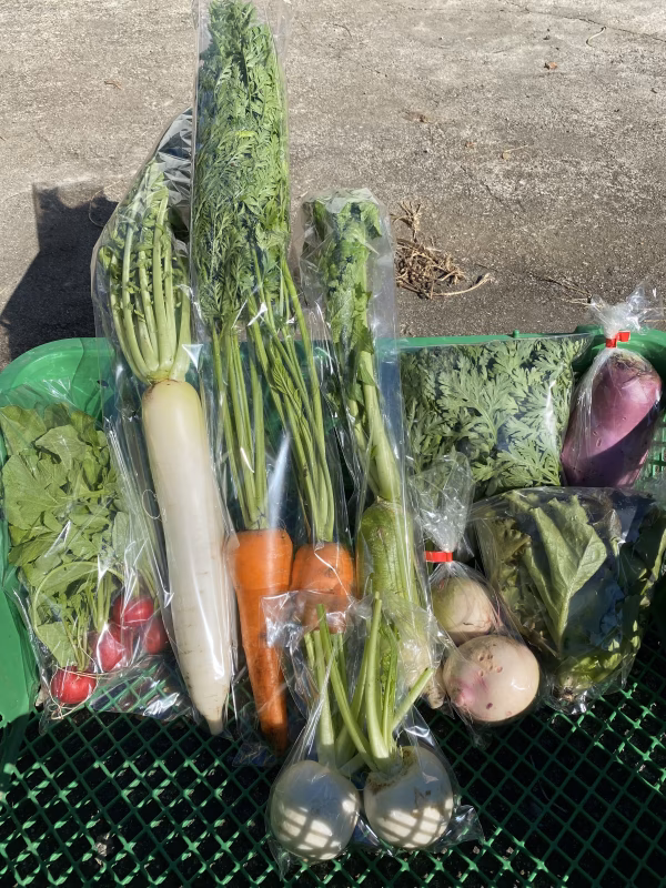 ● 大根(葉付き)、青大根(葉付き)、赤大根、紅芯大根、葉付き人参。春菊、レタス、ラディッシュ、カブの中から、収穫時を迎えた野菜を箱詰めして、クール便にてお届けいたします。