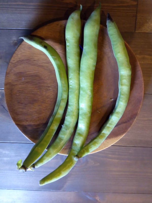 千葉県南房総産のイタリアソラマメ、ファーべです。長いさやは30cm程度にもなり、中にはやや小粒の豆が6〜8くらい入ってます。エグミが少なく食べやすいファーべは本場イタリアでは白ワインとチーズと一緒にいただくことが多いとか。地方によっては若いものを生食することもあるそうです。農薬・化学肥料なしで当方が借りてから肥料を入れていない畑で取れました。