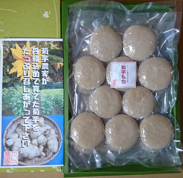 聞きなれない珍しい菊芋餅は、丹精込めて育てた菊芋を福岡県産のもち米に練り込んだお餅で、お正月に食べる白餅とはひと味違った逸品です。