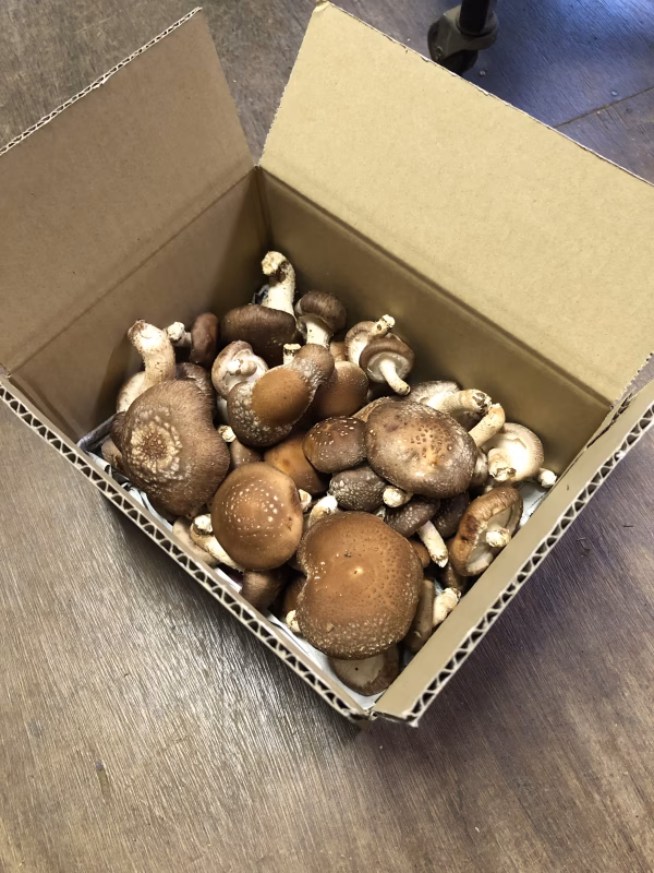 新鮮な朝採りの菌床生しいたけをお徳用に段ボール箱に詰め合わせました