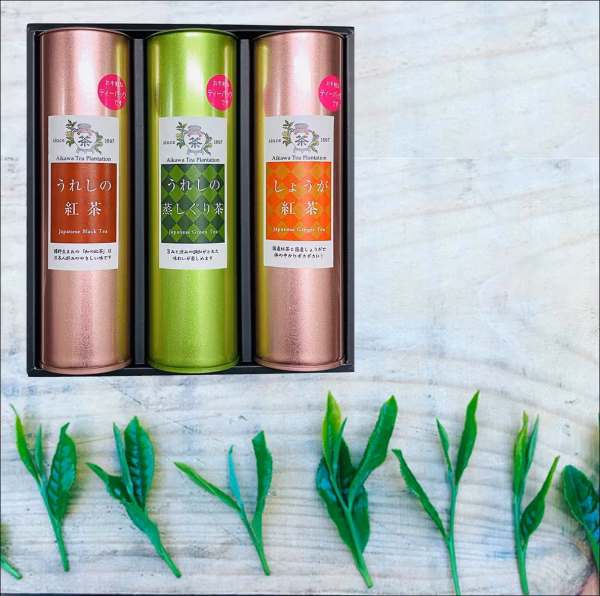 「うれしの茶」、「うれしの紅茶」、「しょうが紅茶」の3本セットギフト。