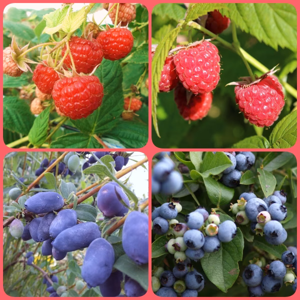 化学農薬、除草剤不使用、有機肥料で育てた北海道十勝産ラズベリー2品種とハスカップ、ブルーベリーのセットです。