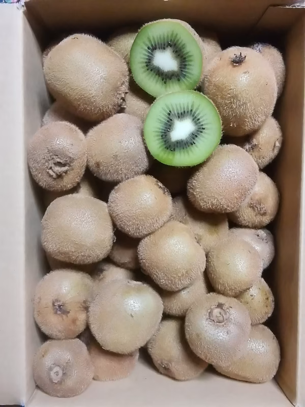 まだかたいですが、室温で、ビニール袋にキウイフルーツ5個に対してリンゴ1個をいれておくと1~2週間前後で食べ頃のかたさになります。冷蔵庫に入れて頂くと長期保存も可能です。