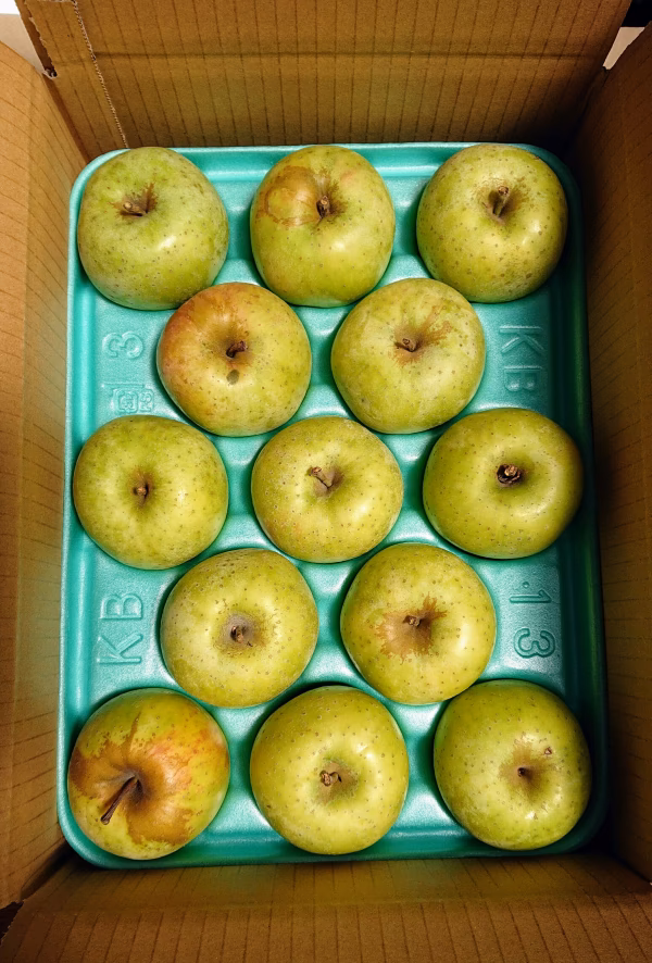 今回の訳あり王林は小玉で昨年の春の霜害により果皮がサビ果等が入ります。