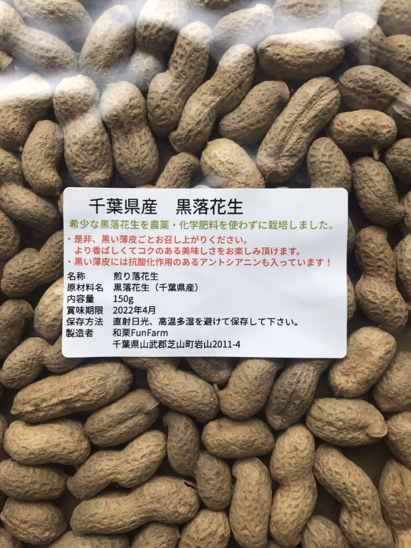 - 名称:煎り落花生 原材料名:黒落花生(千葉県産) 内容量:150グラム 賞味期限:2023年4月 保存方法:直射日光、高温多湿を避けて保存してください。 製造者:和栗FunFarm 千葉県山武郡芝山町岩山2011-4