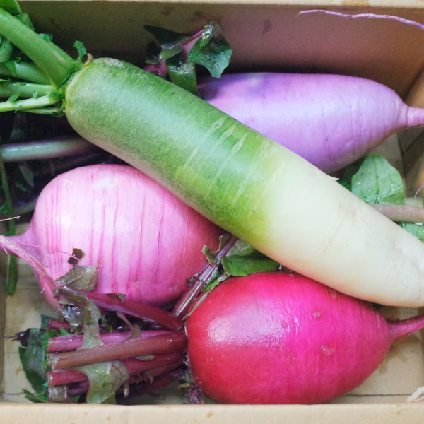 彩りきれいなミニ大根、通常の大根に比べ、辛みはほとんどなく甘みがあり、みずみずしい食感です。