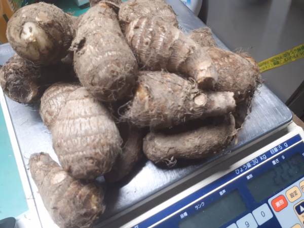 くだもの屋にへじで 普段 商品梱包などを手伝ってくれている オカンの畑でとれた「里芋」が豊作でした(∩´∀`)∩ ※オカン:梨のパンフレットに登場 そこで我が家でも食べきれないと思い この度 初出品のアイテムです。 当園の里芋は「石川早生」だろう的な品種で しずく型のねっとり里芋です。 お詰めする芋は 「孫芋」で「2L玉以上(80g↑)」の もので、簡単に土を落として乾燥した状態のものを 発送します。