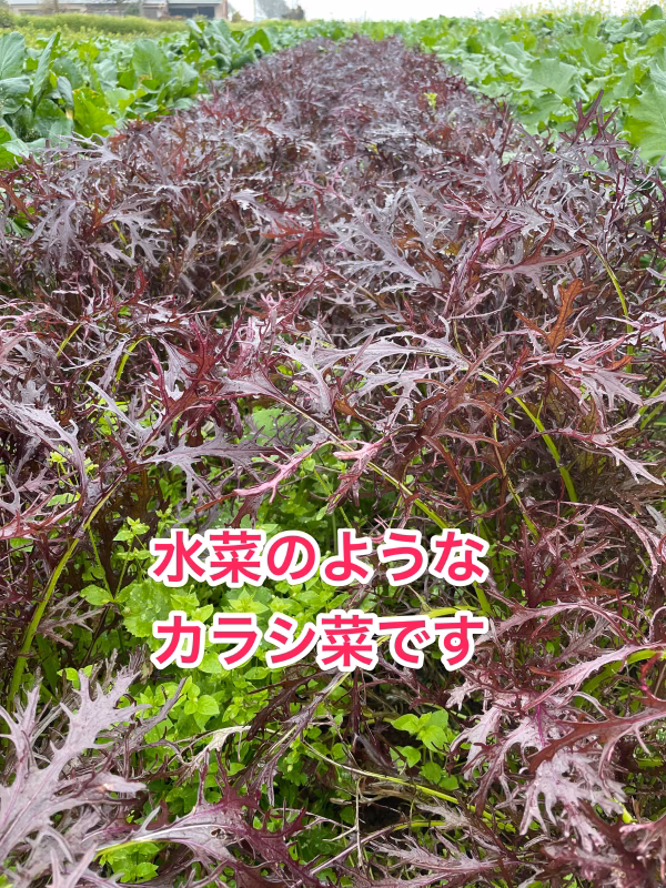 見た目は紫色の水菜のようで、味は少しピリッと程よい辛味のあるとても美味しいカラシ菜です。