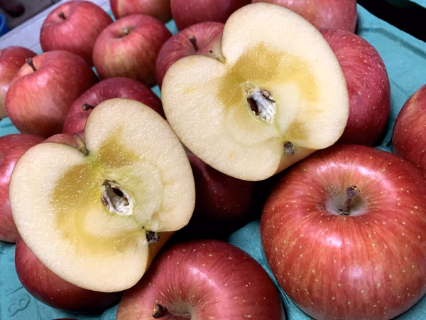 さいとうファームから、『蜜入り完熟サンふじ』です。 もう何も言うことはありません。 リンゴ生産量日本一の青森県、そのおよそ半分が『ふじ』です。 甘さ、酸味、食感と全てそろったりんごの王様です! 『サンふじ』と『ふじ』は同じ品種ですが、『サンふじ』は袋をかけずに栽培する”無体栽培”されたものを言います。 袋をかけずに栽培することで、太陽をたくさん浴びて育つため、特に甘さが際立ちます。 また、特徴の一つに”蜜入り”りんごとなりやすい品種です。 でも、全てに蜜が入っている訳ではありません。自然のものなので、ごく稀に蜜入りでないりんごも、入ることがあります。 私の試食では98%蜜入りです! ★お届け日の指定について ご希望のお届け日がある場合は、事前にご相談ください。 ☆家庭用って? 贈答用の選別から惜しくも小さな傷や、色好きの不良などで漏れたりんごをお届けするものです。 当然ですが、味は一緒です! ☆りんごを美味しく食べるには? りんごは冷やすと糖度が増して感じられる果物です。冷蔵庫で冷やしてからお召し上がりになるとおいしくいただけます。 ☆りんごはどうやって保存する? りんごは、低温で湿度の高い場所で保存すると長く日持ちする果物です。  ご家庭でりんごを上手に保存するには、りんごの表面を霧吹きなどで濡らし、そのままビニール袋にいれて密封して、冷蔵庫の野菜室で保存すると、長く日持ちします。霧吹きでりんごの表面を濡らしておくと、冷蔵庫の中に保存しても水分が失われるのを防ぎ、みずみずしい状態を比較的長く保つことができます。