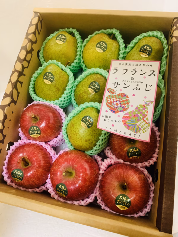 ラフランスは6〜7個ふじりんごは6〜5個で1箱に12個前後入っています。収穫により個数が変わることがありますが、量目は変わらないのでご了承下さい。