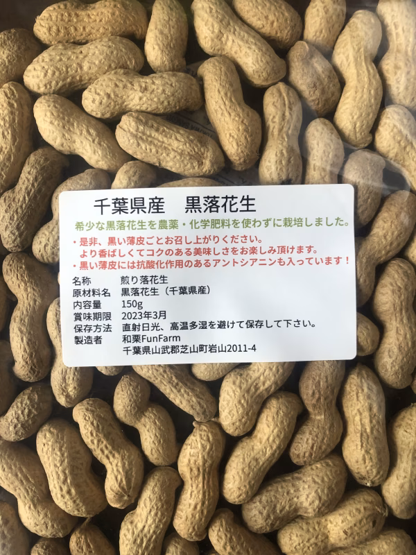 - 名称:煎り落花生 原材料名:黒落花生(千葉県産) 内容量:150グラム 賞味期限:2026年3月 保存方法:直射日光、高温多湿を避けて保存してください。 製造者:和栗FunFarm 千葉県山武郡芝山町岩山2011-4