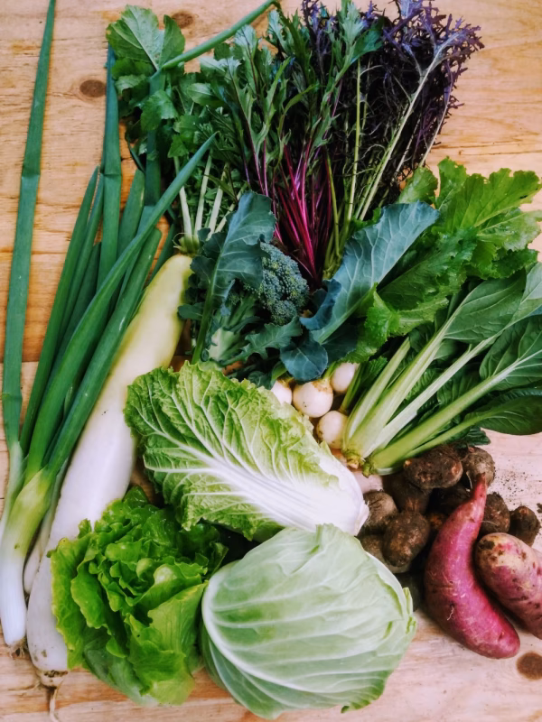 さつまいも、里芋、小松菜、生姜、白菜、九条ネギ、かぼちゃ、小かぶ、ルッコラ、カラシ菜、水菜、ブロッコリー、カリフラワー、キャベツ、ケール、人参、大根、などのお野菜の中からその時に状態の良いものをピックアップして、8品程度のお野菜を入れさせていただきます。(畑の状況によっては、ここに載っていないものが入る可能性もありますので、どうぞご了承くださいませ)