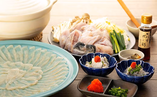 ふぐのサイズも1.2Kg以上の大きいものを使っていますので、食感、旨み、出汁全てにおいて高品質な一品です。ふぐの刺身、ふぐちり鍋、ふぐ雑炊、ふぐのひれ酒。ご家庭でとらふぐのコースが召し上がれます。