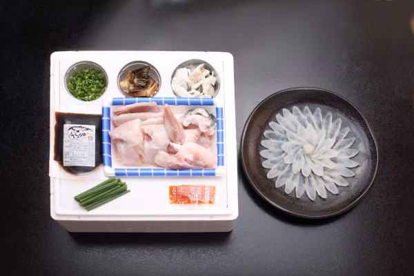 ふぐのサイズも1.2Kg以上の大きいものを使っていますので、食感、旨み、出汁全てにおいて高品質な一品です。ふぐの刺身、ふぐちり鍋、ふぐ雑炊、ふぐのひれ酒。ご家庭でとらふぐのコースが召し上がれます。