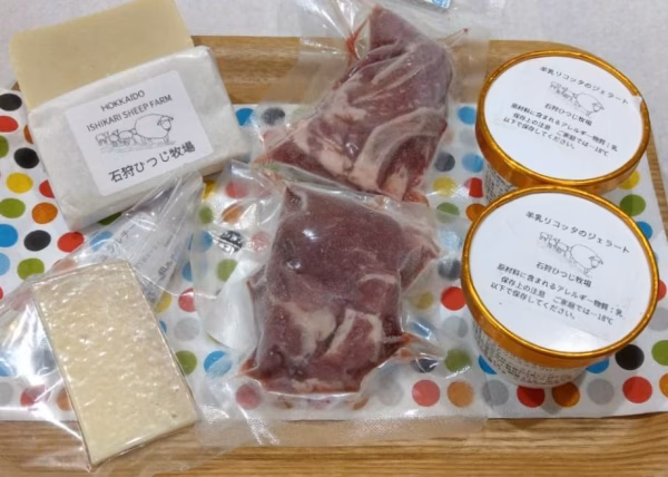 石狩産の羊乳リコッタのジェラート 100ml×2個、ペコリノイシカリーノ50g前後、羊肉200g前後、せっけん100g前後