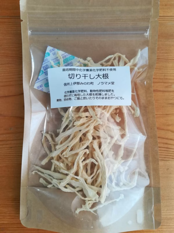 化学農薬、化学肥料、動物性の堆肥、肥料を使わずに栽培した大根を切り干し大根に、その葉も乾燥させました(葉は、小松菜など他のアブラナ科の葉と同じ緑黄色野菜です)。