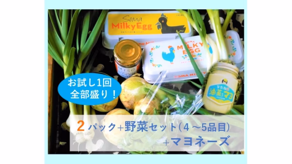 この商品はお試し1回お届けするものですが、もし「気に入った!定期的に届けてほしい!」という方は、大野村農園の商品一覧に「ミルキーエッグ+月替わりおまかせ野菜セット【月1定期】」もございますので、そちらもぜひチェックしてみて下さいね!(ミルキーエッグ2パックと今回と同じくらいの量の野菜が毎月届きます。なお、マヨネーズは定期便のセットには入っておりません。)