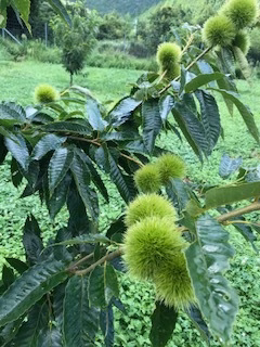 山際にある1ヘクタールの栗園で早生から晩生までいろいろな種類の栗を栽培しています。