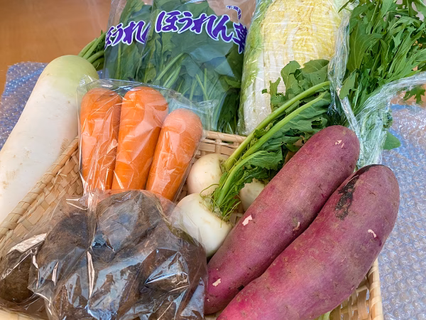 里芋、大根、かぶ、白菜、ほうれん草、サツマイモ、水菜や春菊、にんじんなど、これから美味しい冬野菜を、どーんと4㎏超詰めました。