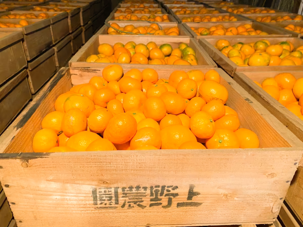ここ下津町で昔から続く手法で、収穫したみかんを新鮮なうちに専用の木箱に入れ、土壁作りの貯蔵庫の中で甘く熟成させます。木箱に入れ土壁の蔵で保存する事で、みかんにとって最適な温度・湿度が保たれます。みかんにとって最適な環境で熟成されたみかんは、余計な酸味が抜け、口あたりの良い甘みの強いみかんに仕上がります。