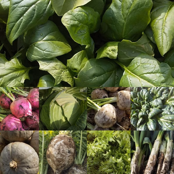 ニンジン、ジャガイモ(デジマ、メークイン)、カボチャ(とっておき)、葱(松本一本、鍋ちゃん)、里芋(土垂、女早生)、サツマイモ(紅あずま)、大根(青首、聖護院)、カブ、ラディッシュ、赤カブ(生食用)、紅芯大根、白菜、キャベツ、ブロッコリー、カリフラワー、小松菜、京菜(晩生種)、チンゲンサイ、ターサイ、ほうれん草などが入る予定です。上記の中から10種類前後、根菜と葉菜のバランスを考えセットにさせていただきます。