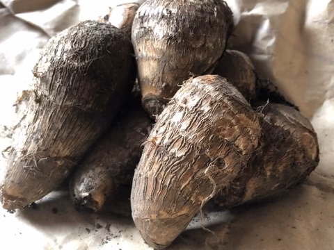自然の恵みの中で雑草と戦いながらがんばって育った里芋です。