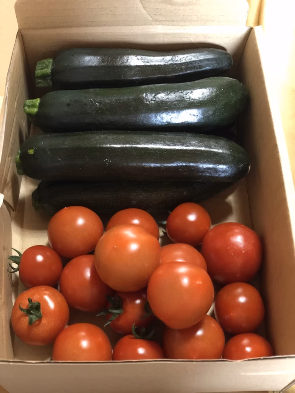 中玉トマトのフルティカとズッキーニを1.5キロ箱にお詰めして販売いたします!
