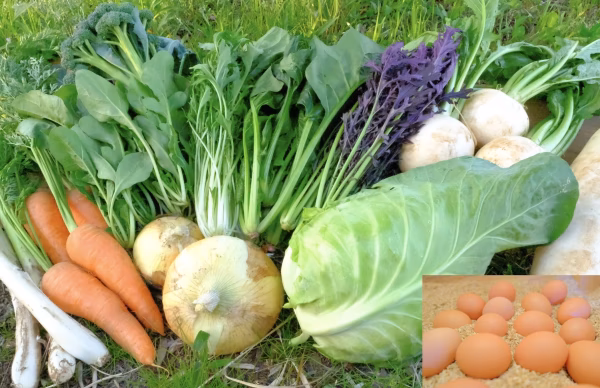• 月1回、旬のお野菜セット(小セット、中セット)と平飼い有精卵6個