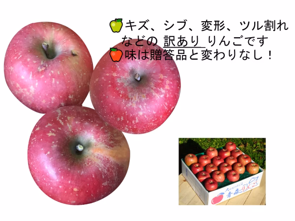キズ、色ムラ、変形、サビ、ツルワレ等外見の欠点がございますが、 食味は贈答用と遜色のない、濃厚で甘みたっぷりの完熟りんごです。