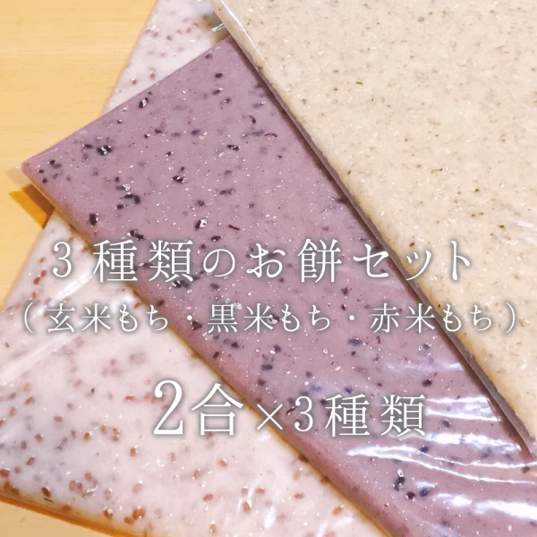 無農薬・無肥料で育てたもち米マンゲツモチの、「玄米もち」「黒米もち」「赤米もち」の3種類のお餅、のし餅2合分×3枚のセットです。