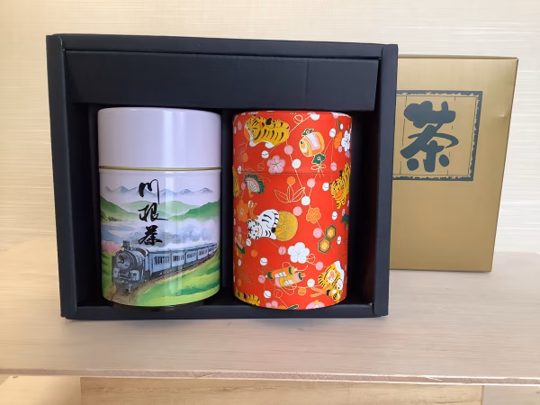 川根の茶畑を走るSLと2022年寅年の和紙缶です。