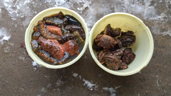 アワビ5個(約500g)、ナマコ約500g 、いづれも水揚げ時点の重さですのでご了承下さい。