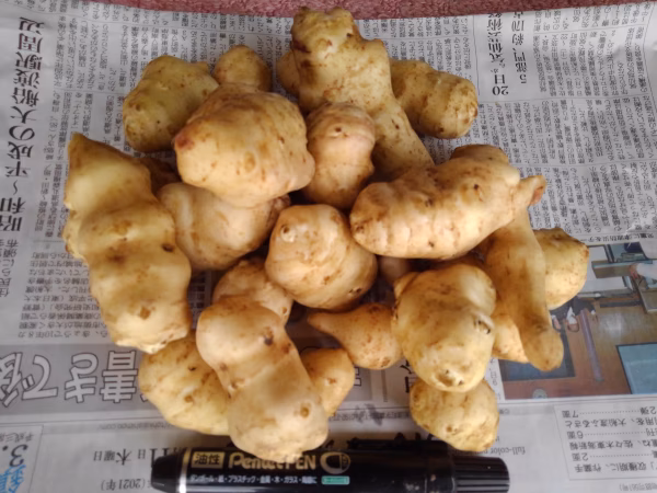 こんにちは! 岩手県陸前高田市「気仙横田うえのだい農園」の杉山と申します。 ▼商品概要・味の特徴・食べ方 キクイモ(菊芋)です。 収穫して、土付きの状態で籾殻中や土中に保管していたものを洗ってお届けいたします。 一枚目の画像でおよそ1kgです。 (洗ってしまうと常温で2~3日程度で鮮度落ちてきますが、土付きですと1週間程度、冷蔵ではそれ以上鮮度を保てます) 見た目生姜のようですが、シャリッとした食感でゴボウのような風味です。 当地では漬物(味噌漬け、ぬか漬けなど)にして食べる方が多いようですが、火を通すとシャリッとした食感にホクッとした食感が加わってきますので、炒めもの、素揚げ、オーブン焼きなどもお勧めです。 また、味噌汁等に入れていただいても美味しくいただけます。 いずれも、良く洗って皮付きで頂けます。 栽培期間中農薬・化学肥料不使用です。施肥自体しておりません。 当農園の土質、キクイモの形状の関係で「脇」に粘土質の土を抱え込んでいる個体があり、土が取りきれていないものが混入する可能性がございますのでご了承下さい。その際は割ったり切ったりしたあとに再度洗って頂けますときれいに土が取れます。