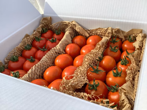 ダンボール箱にバラで詰め、紙のガムテープで梱包します。箱内の緩衝材は紙製のもののみを使います。一般的にスーパーで販売されているミニトマトが170から200gなので、ミニトマトパック6~7パック分に相当します。トマト好きな4人家族であれば1週間で食べきる量かと思います。