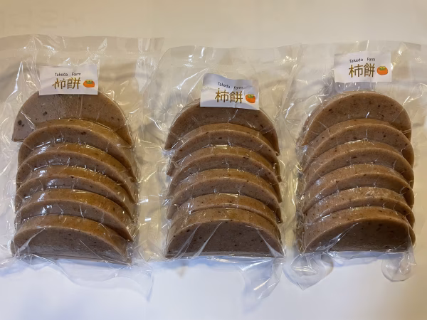 自家製干柿を自家栽培したコガネモチに練り込まれた切り餅です。ほんのり素材の甘みがあって、飽きがこない味に仕上がっています。栄養満点のファーストフード。