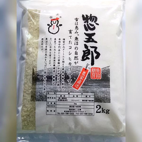甘味と粘りが自慢の魚沼産コシヒカリ「惣五郎」は「冷めても美味しい!」と好評です。 一般的にお米は、梅雨時期から味が落ちると言われていますが、「惣五郎」は違います!なぜなら雪室保存だがら! 雪室とは自然の雪を利用した雪国ならではの低温倉庫です。令和4年の春以降に出荷するお米はこの雪室保存米となります。一年を通して美味しいお米をお楽しみ頂けます。 2kg入りと5kg入りの袋がございます。お好みの量をお選びください。