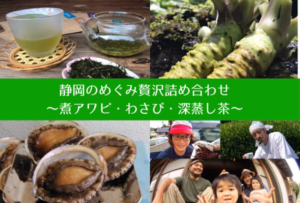 食卓が一気に晴れやかになる「漁師のお袋の味」で煮付けたアワビを2個と、静岡県が誇る「わさび」と「深蒸し茶」を贅沢に詰め合わせセット販売いたします。
